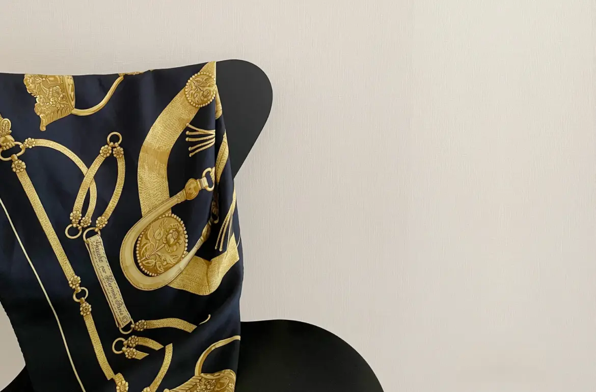 このスカーフは、19歳の時、はじめてのパリ旅行で買い求めました。言葉もできないのに、ひとりでお店に行った記憶があります。ぎこちない英語でのやりとり。それでも、お店の方は、ショーケースの上に数枚のスカーフを広げ、見せてくれました。