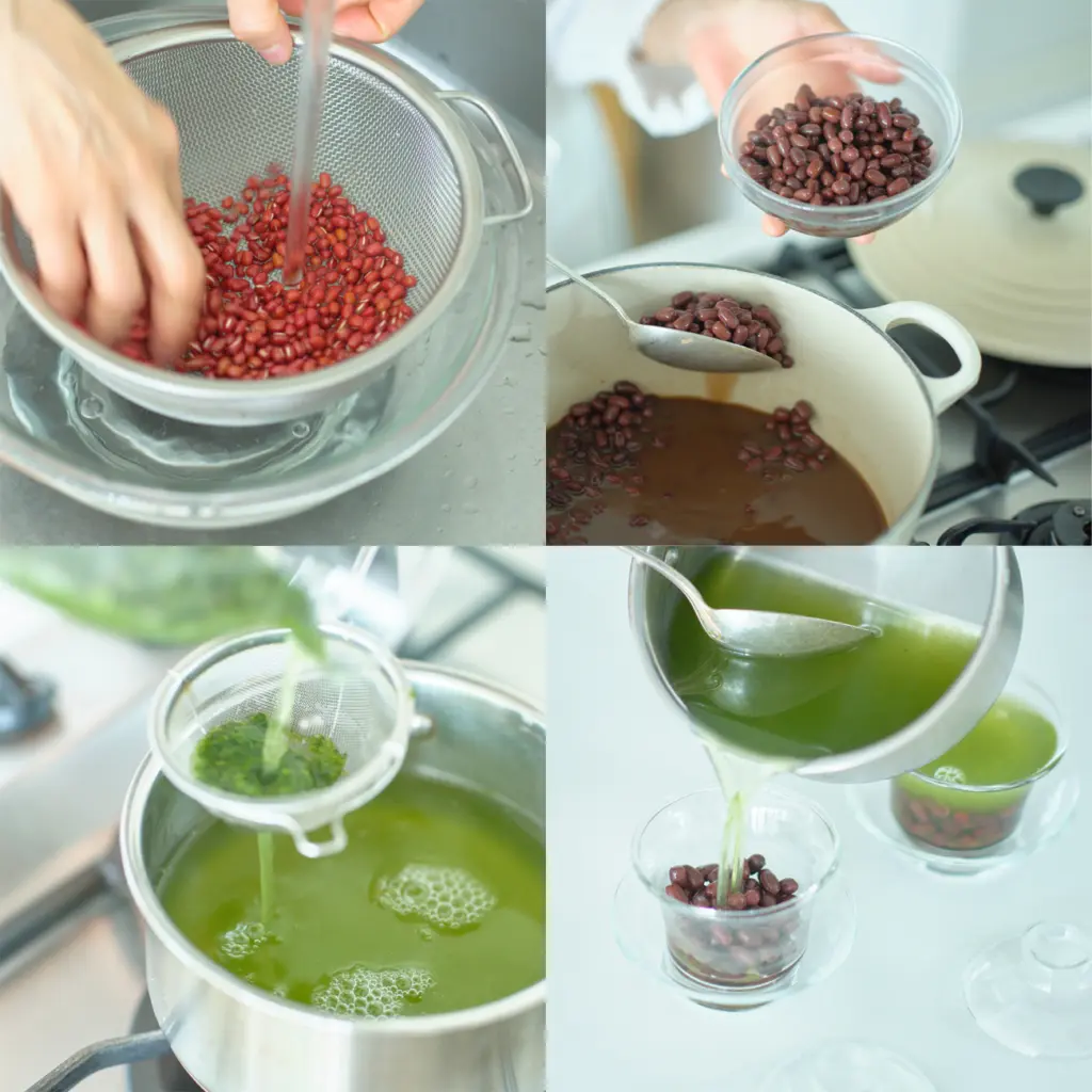 - グラスに2のゆであずきを大さじ2ずつ入れ、3を100mℓずつ注ぐ。冷蔵庫に入れ、1時間以上冷やす。