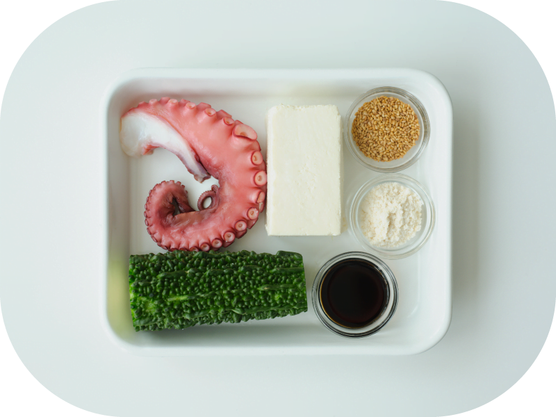 - ゴーヤは薄切りし、しょうゆ小さじ1/2をまぶし、軽くもむ。たこは食べやすく切り、酢少々で洗い、余分な汁気は捨てる。