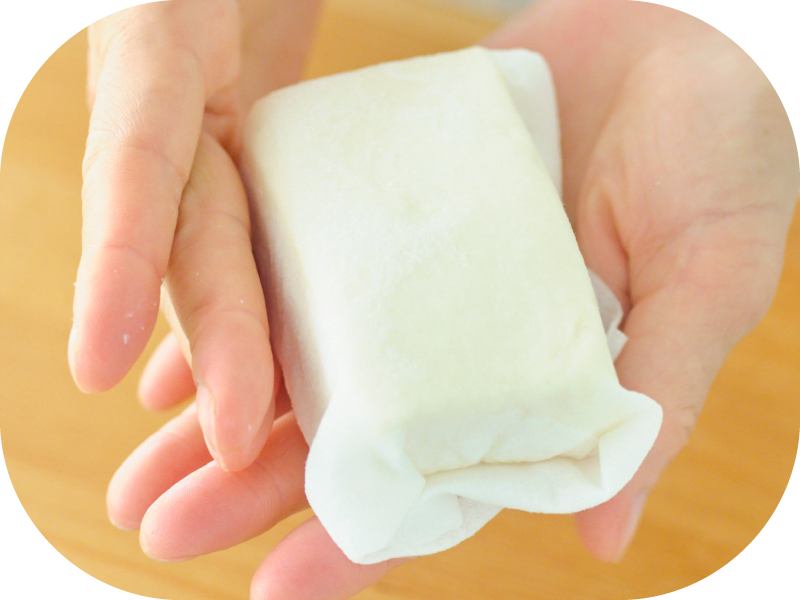 - 豆腐は厚手のキッチンペーパーで包み、600Wの電子レンジで3分加熱し、水切りする。