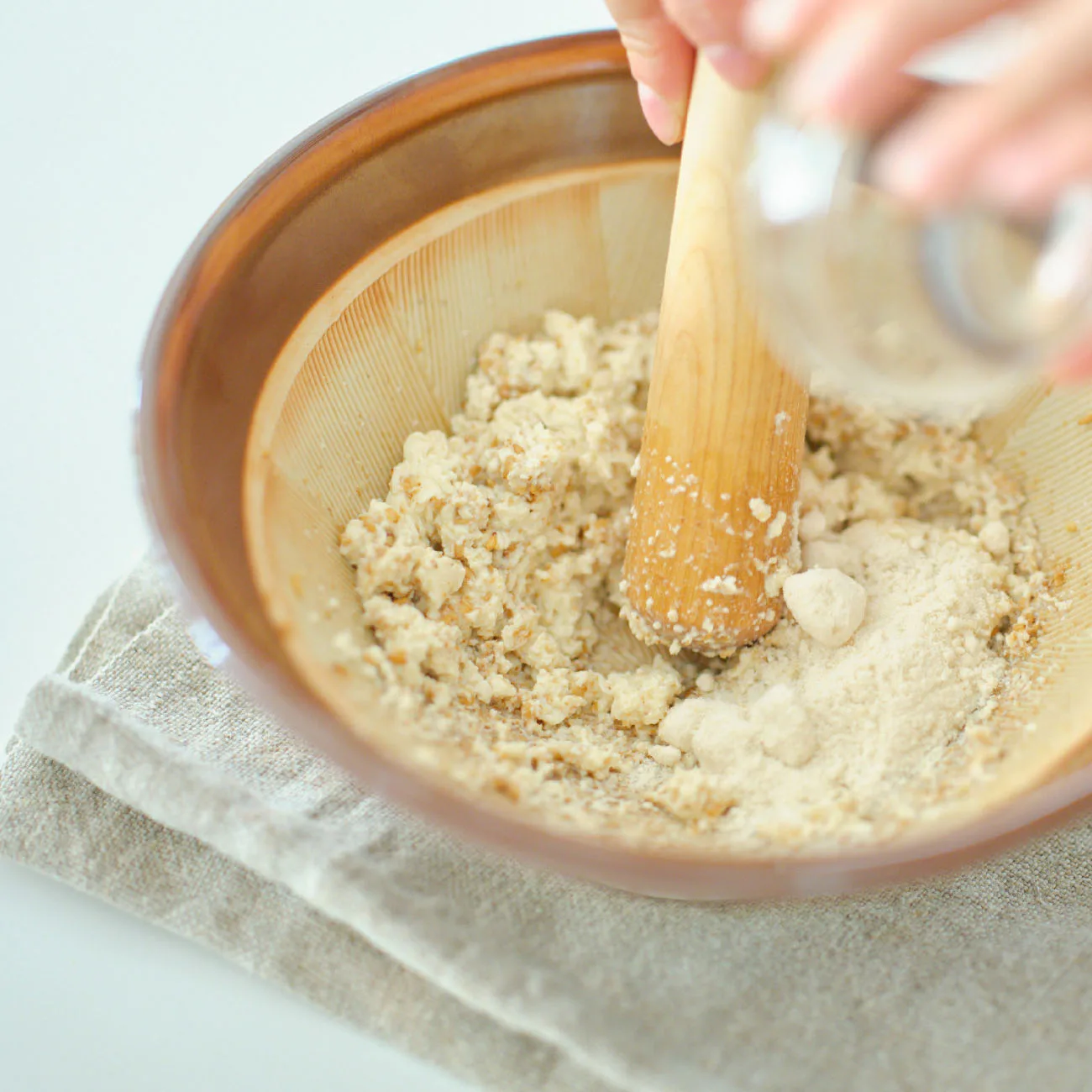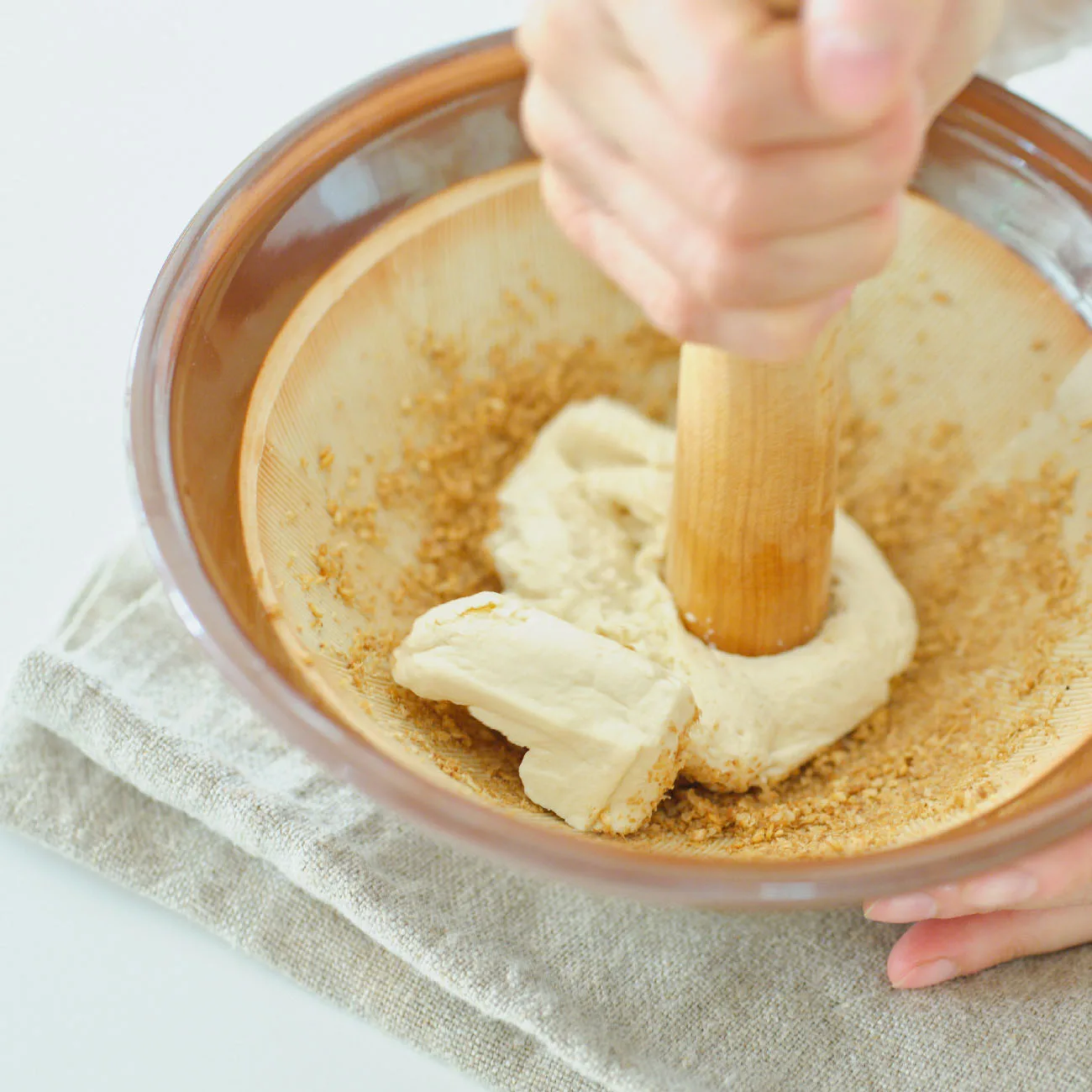 - フライパンにごまを広げ、ゆすりながら2~3分乾煎りする。すり鉢に入れ、熱いうちに滑らかになるまでする。