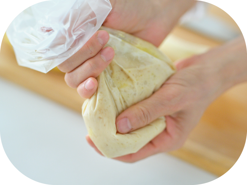 - ポリ袋にバナナ1/2本、1の玉ねぎ、Aを入れ、手でもんでドレッシングを作る。なめらかになったらボウルに入れる。