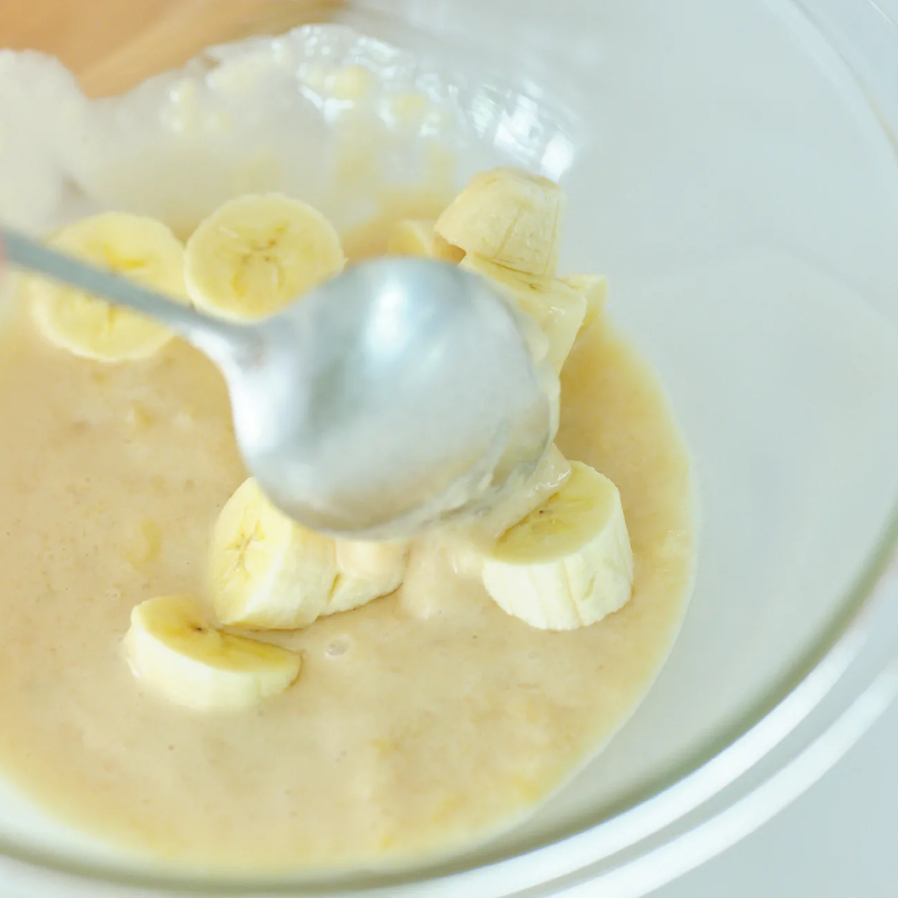 - 2のボウルに食べやすく切った残りのバナナ、1のサツマイモを加え、ざっくりと混ぜる。