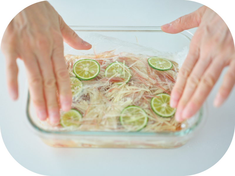- 1のみょうが、せん切りのしょうが、輪切りのすだちをのせ、表面全体にラップをかぶせる。冷蔵庫に入れ、1時間以上なじませる。