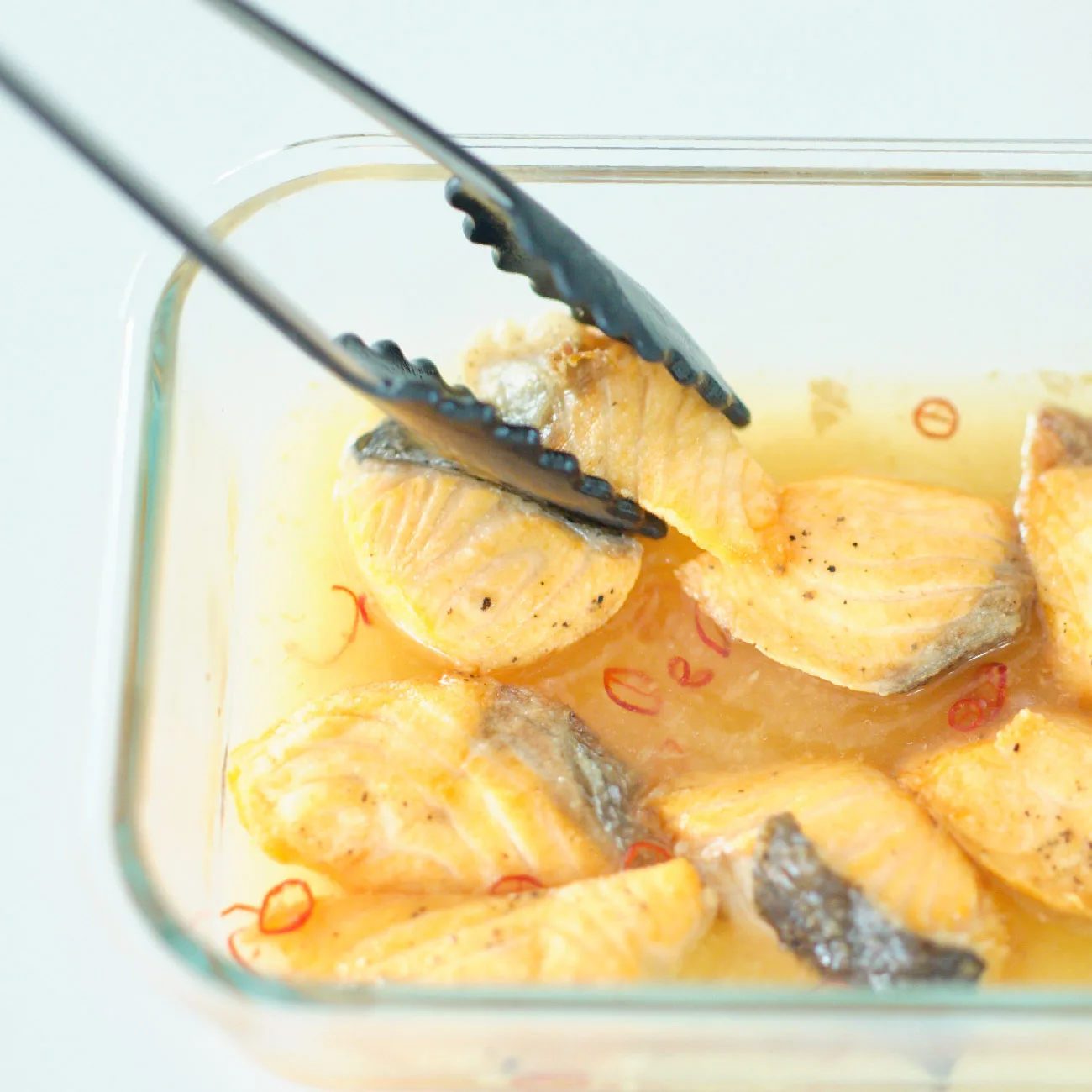 - 1の鮭はキッチンペーパーで出てきた汁気を再度拭き、小麦粉をまぶし、余分な粉をはたく。揚げ油を中温に熱し、からりと揚げ、熱いうちに2に入れる。