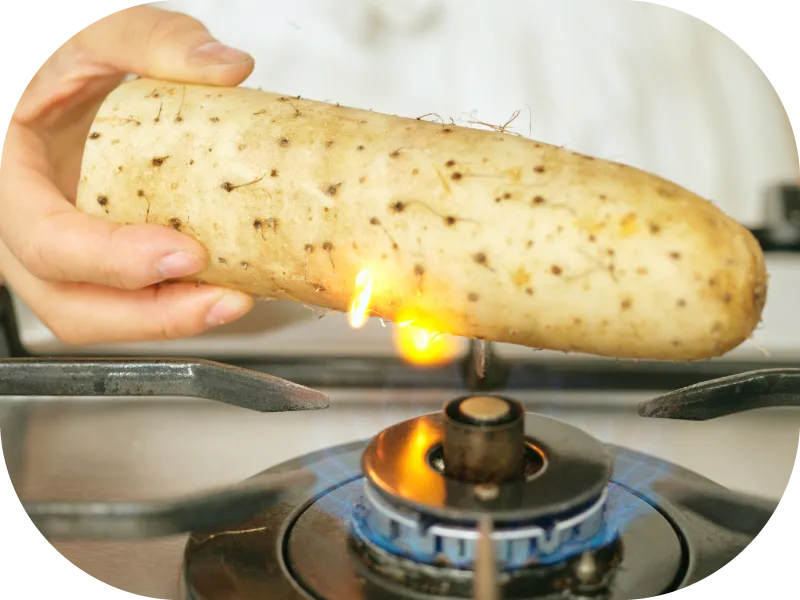 - 山いもはたわしなどでこすり洗いし、水気を拭く。手で持って回しながらガス火であぶり、ひげ根を取る。皮ごと2㎝角に切る。長ねぎは粗みじん切りにする。