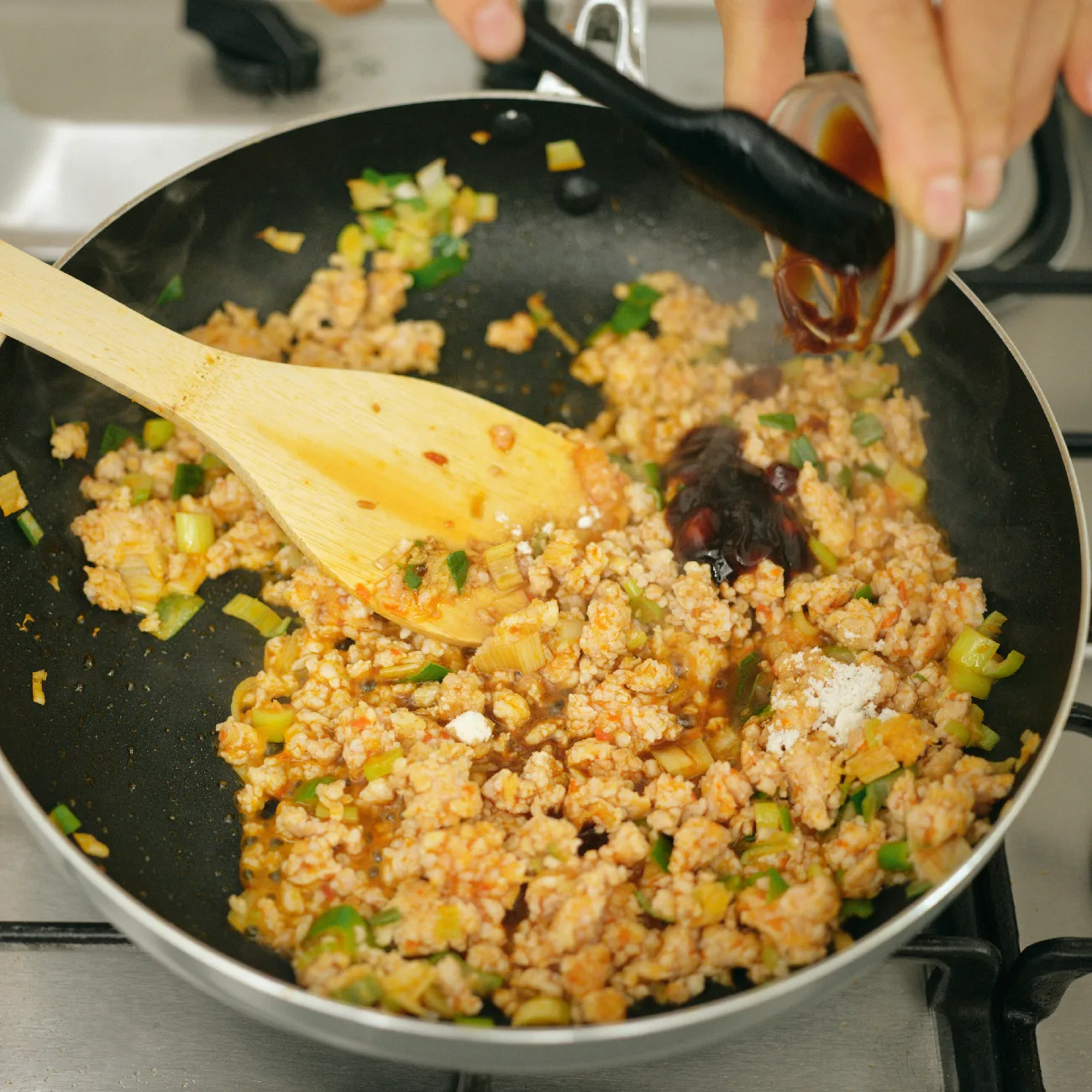 - ライパンにごま油を中火で熱し、豆板醤を加える。香りが立ったらひき肉を加え、炒める。肉の色が半分ほど変わったら、しょうが、にんにく、長ねぎの半量を加え、さらに炒める。