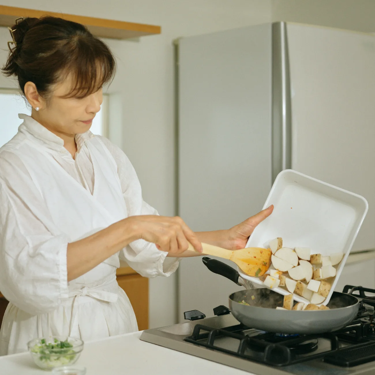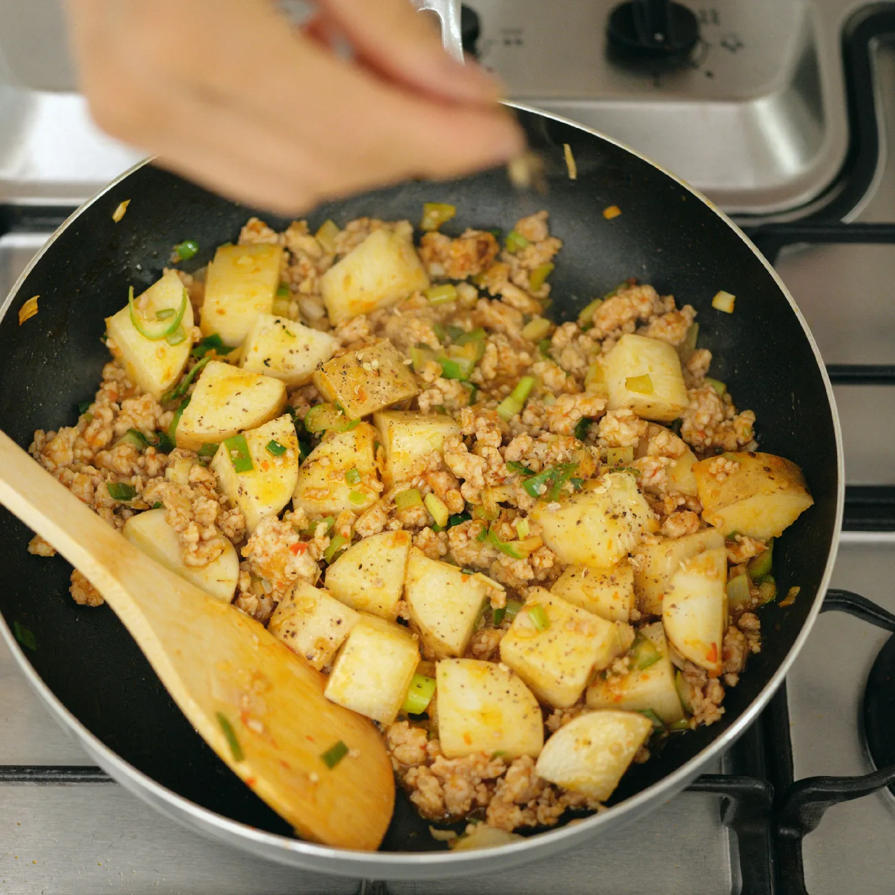 - A、水50mℓを加えて混ぜ、1を加える。汁気がなくなり、山いもが温まるまで2~3分加熱する。