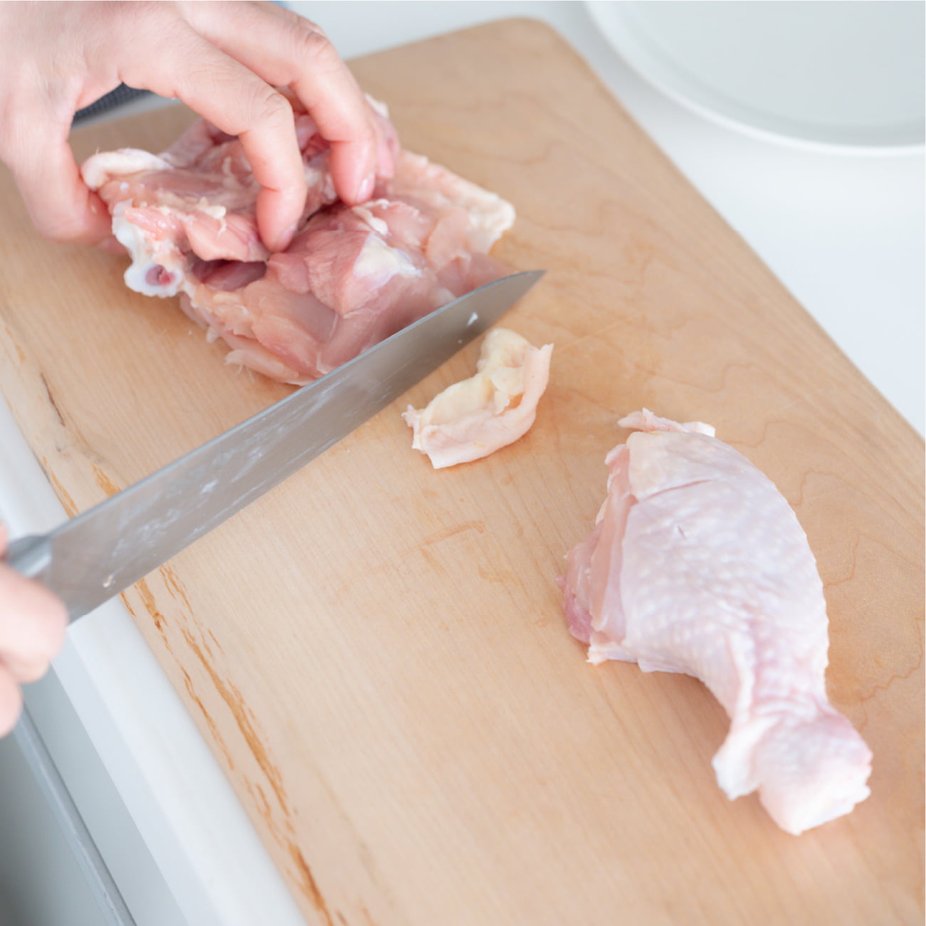 - 鶏肉は関節部分に包丁を入れ、半分に切り、さらに食べやすい大きさに切る。