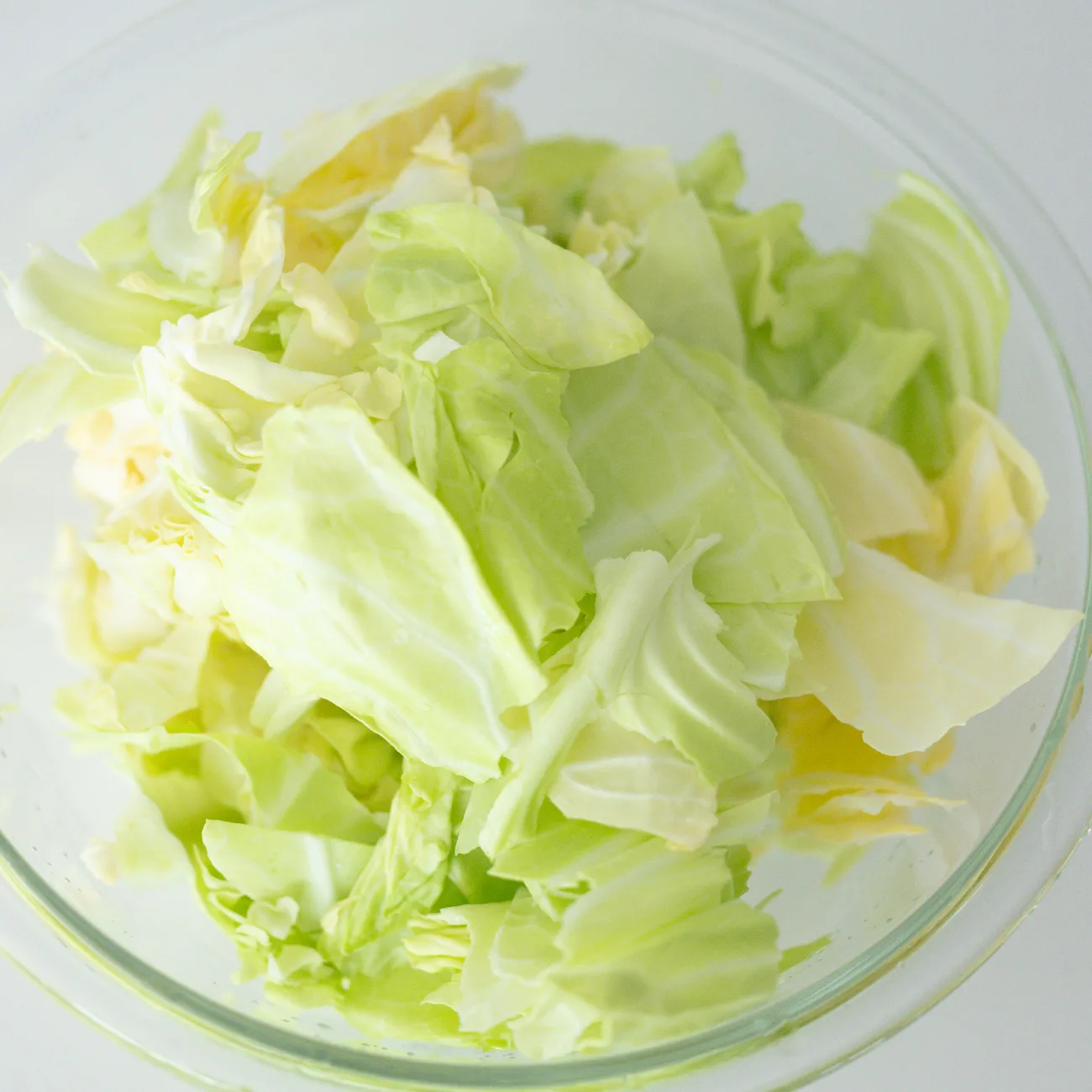 - キャベツはざく切りにし、芯の硬い部分は薄切りにする。ボウルに入れて水に3分さらし、ざるに上げる。