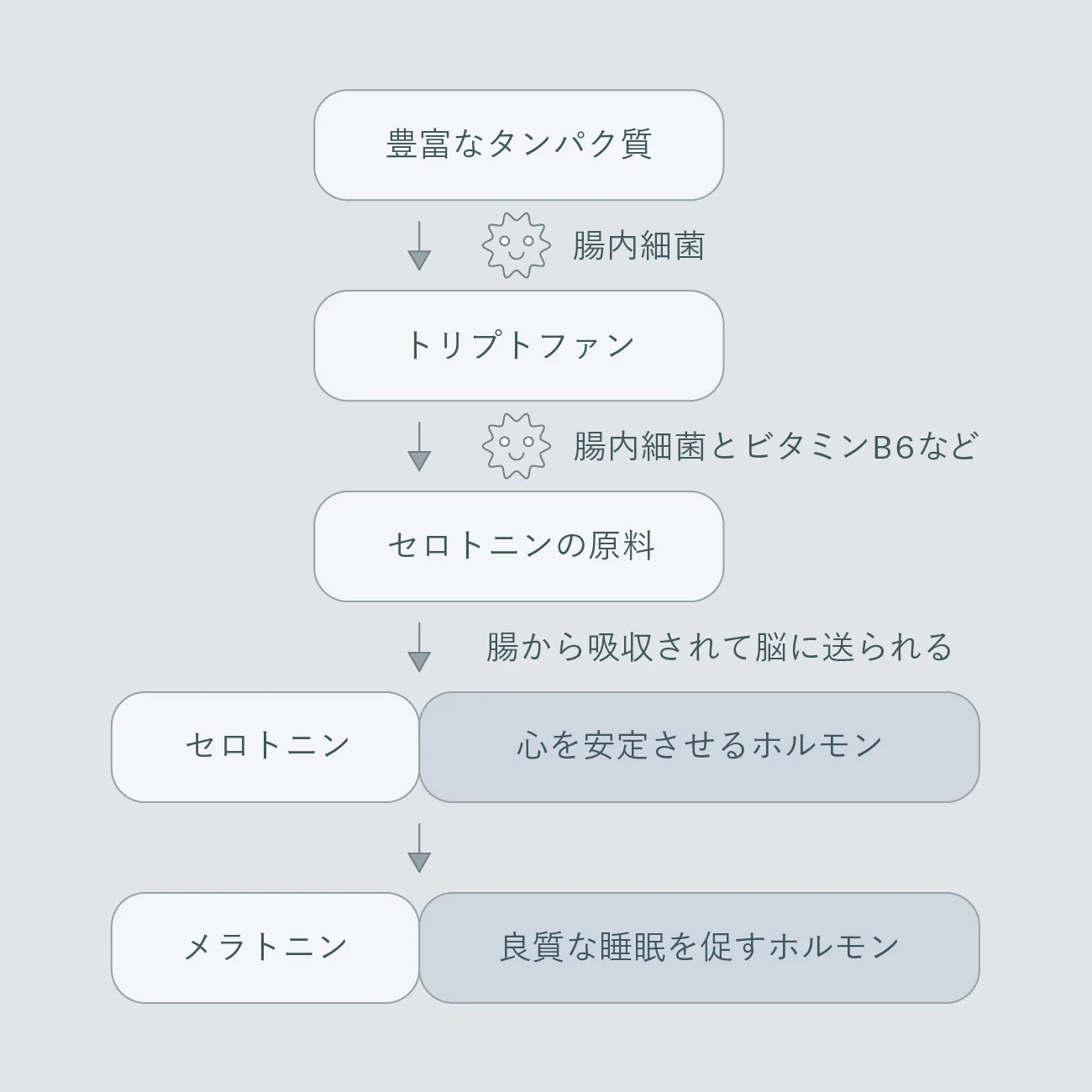 まず、トリプトファンを含む食品のタンパク質が、腸内細菌によって合成・分解され、トリプトファンとして吸収されます。さらにこのトリプトファンは、腸内細菌やビタミンB6などの力を借りて、セロトニンの原料に変換された後に脳に送られ、セロトニン、そしてメラトニンへと合成されるのです。