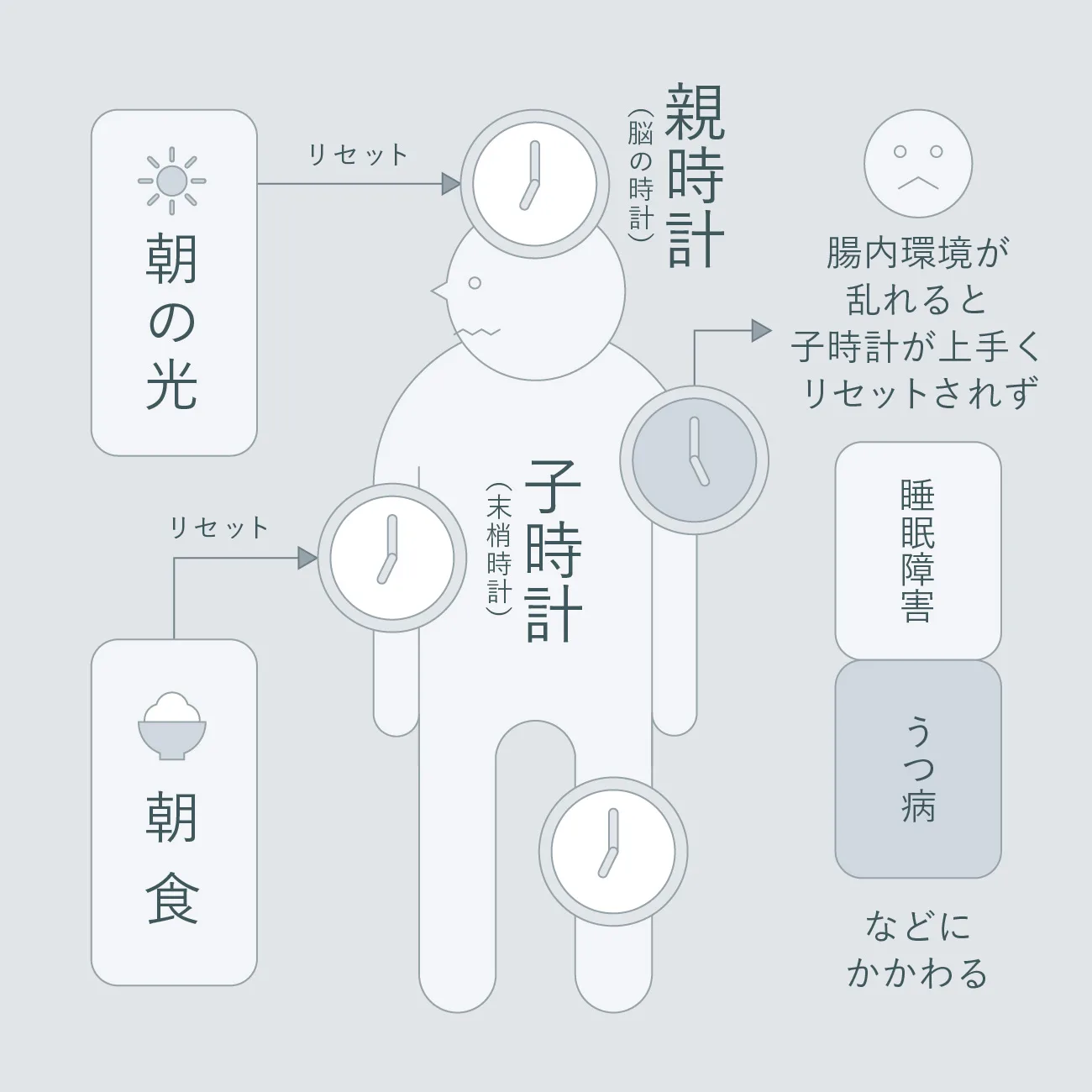 「地球の1日は24時間ですが、私たちの概日リズムは24時間15分~45分といわれていて時差があります。だから体内時計を規則正しくリセットしないと、時差ボケになってしまい、睡眠の質も下がってしまうのです」