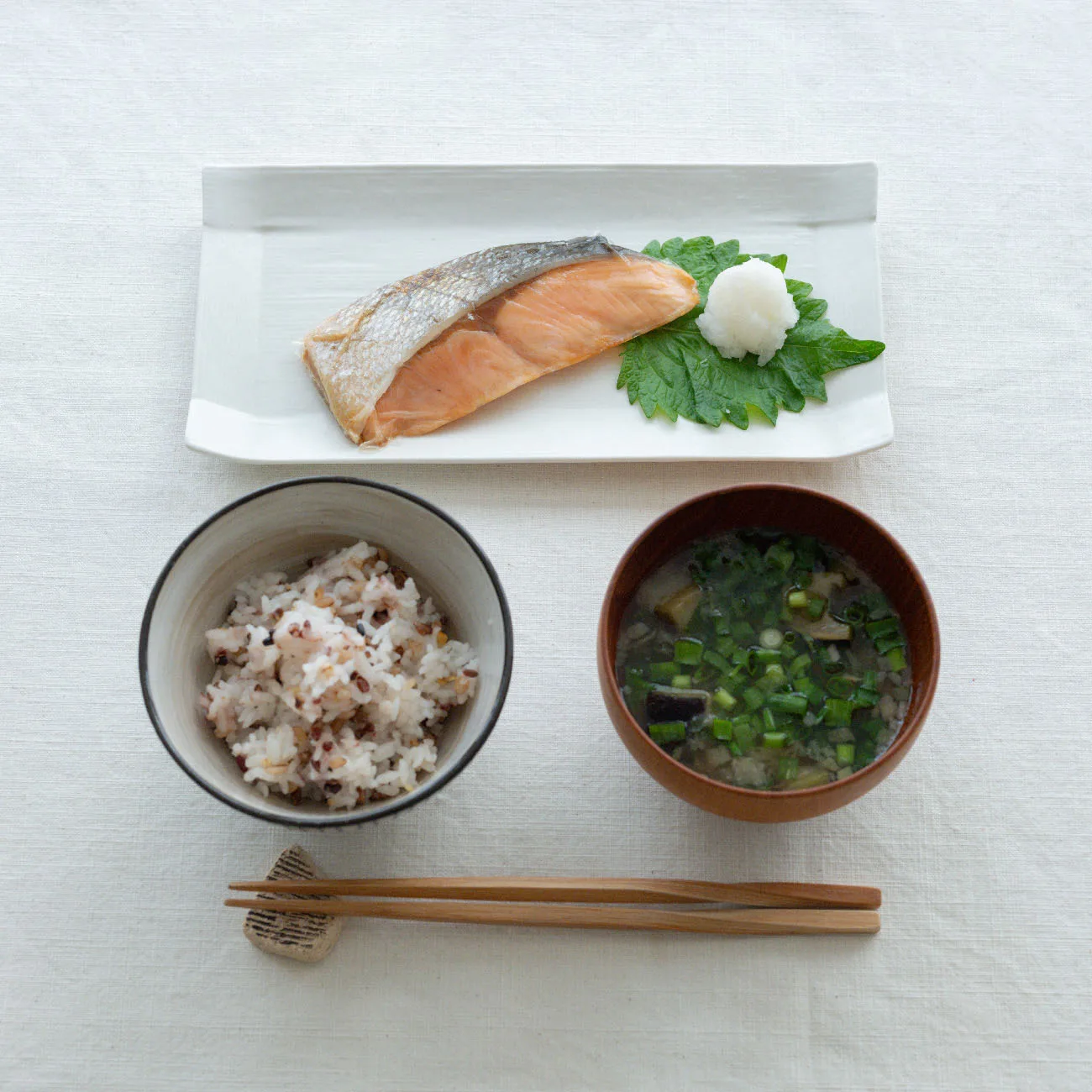 まずはごはんとお味噌汁という基本の組み合わせを、ゆっくり噛んで食べてみて。