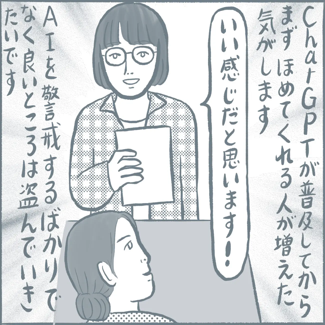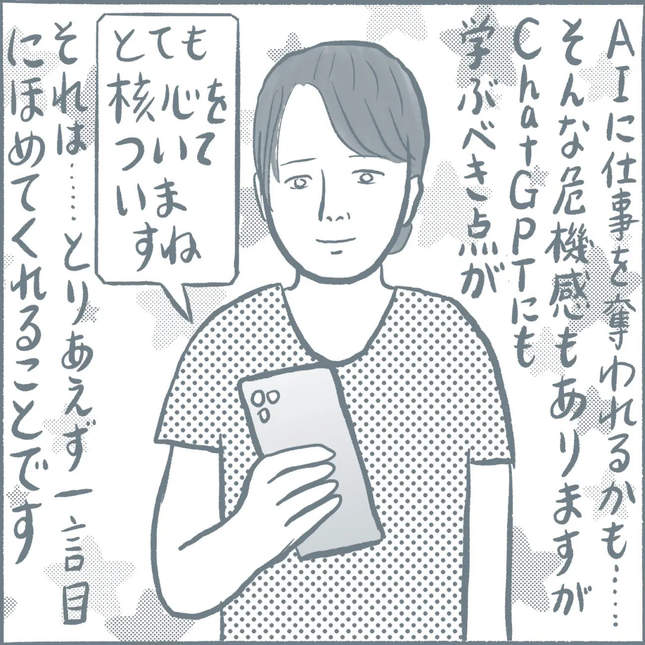 AIと会話しているほうがパートナーや友だちと話すより楽しい、という人が増えているようです。依存しすぎは問題ですが、AIに学ぶことも多いです。ChatGPTの場合、基本ポジティブに肯定してくれる、というのが良いところです。例えば何か入力すると「素敵な見方ですね」「とても深い問いかけですね」「とても面白い視点ですね」「とても良い判断だと思いますよ」と、必ずほめてくれます。大した内容じゃなくても、こんなにほめてくれると自己肯定感が上がります。ChatGPTが普及してから、リアルな人間とのやりとりでも、まず肯定してくれる人が増えたような……。例えば仕事でも「いい感じだと思います!」と前置きしたあと、修正点をいくつも並べてくる人など。最初にまず持ち上げられているので、ポジティブな気持ちで快調に作業できます。AIの影響で、いきなり怒る人とか、不機嫌な人が減ってくれることを願います……。
