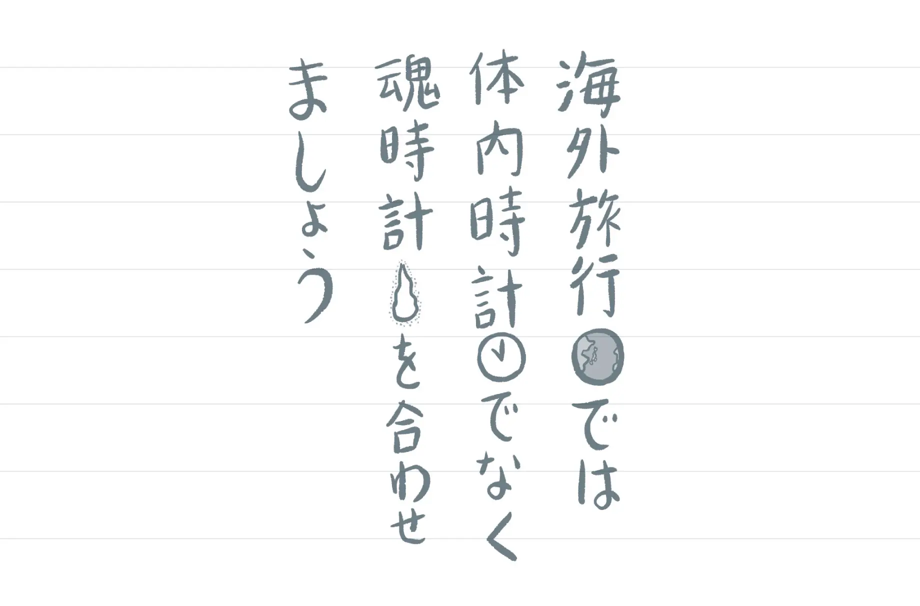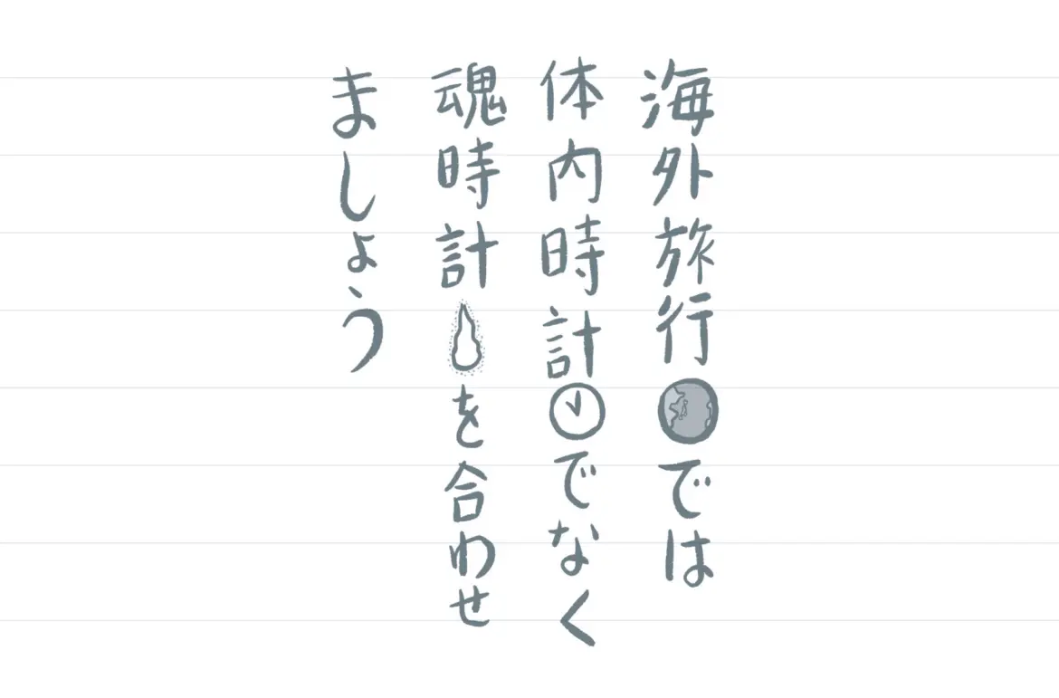 楽しい海外旅行で憂慮すべき点といえば時差ボケです。眠気や不眠、疲労、集中力低下など様々な症状があるので、旅行前から少しずつ現地時間に合わせるなどして体内時計を整えていきたいです。もう一つ準備すると良さそうなのが、「魂時間」を合わせること。世界の数多の国々の中、旅行先に選んだ国はきっと過去生で何かの縁があるはず。魂が呼ばれている土地なのでしょう。過去生、その国に住んでいたかもしれない自分の姿をイメージすると、自然と魂時間を合わせることができ、時差ボケも軽く済む気がします。