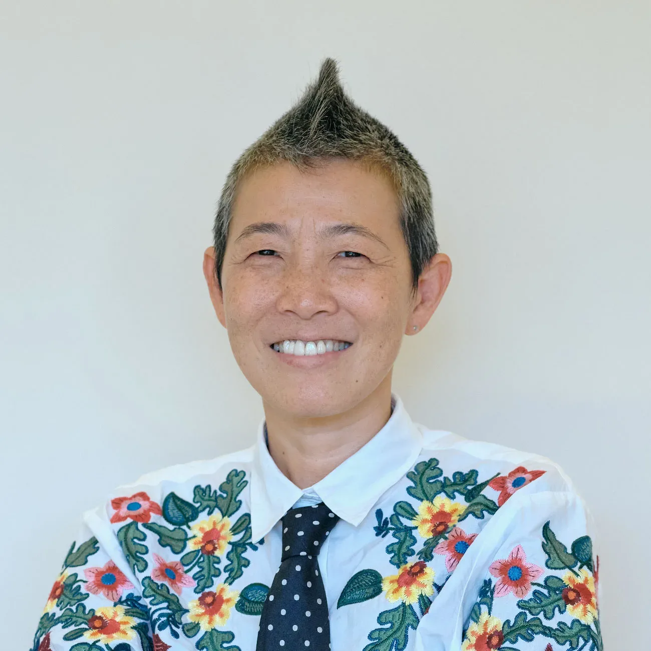 「はーい、こんにちは〜!」元気な声が部屋に響いた瞬間、その場がパッと明るくなりました。華やかな刺繍シャツにネクタイ、カジュアルなデニム。そしてソフトモヒカンのとんがりヘア。はつらつとした笑顔で登場したのは、産婦人科医の高尾美穂さんです。