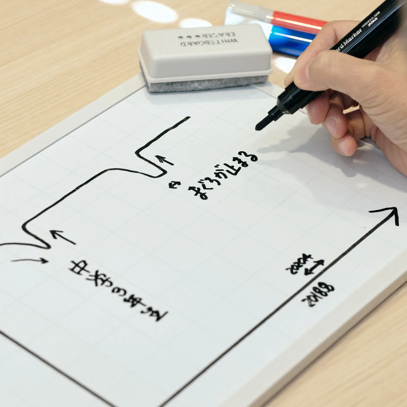 人生曲線を書いてくださいとお願いすると「うーん、どんな感じかなあ。最初から低い人はいないから、必ず高いところから始まるよね」と、ペンを片手にニコニコ顔。その言葉にも、独自の人生観が見えるようです。