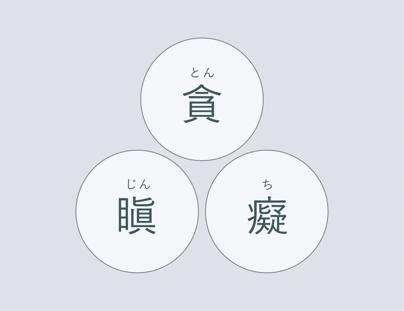 「煩悩」は108つもあると言われたりしますが、根本的には大きく3つに集約されます。「貪(とん)=むさぼり」「瞋(じん)=いかり」「癡(ち)=おろかさ」の3つです。「貪」は他人を押しのけてでも、自分だけが得をすればいいと考えてしまう心。「瞋」とは自分の欲望が思い通りにならないことに感情的になり、他人や自分を激しく攻撃する感情。「癡」は物事の道理を自分の都合のいいようにねじ曲げて解釈する心。